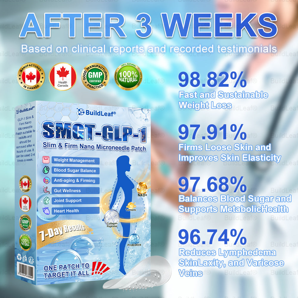 Health Canada-cleared and clinically proven, this non-invasive patch combines SMGT-GLP-1 technology with NAD+, Curcumin, and Matrixyl 3000 to burn fat, balance blood sugar, boost metabolism, relieve joints, support bones, lift and firm skin, and promote anti-aging. Delivers actives deep into skin to regulate insulin, suppress glucagon, and slow gastric emptying—without drugs, injections, or side effects.